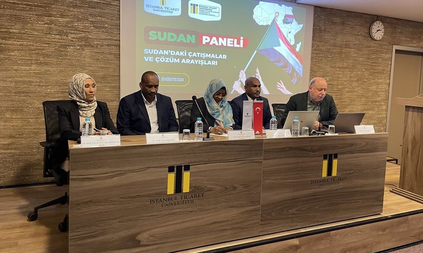 Sudanlı uzmanlar, dış müdahaleler nedeniyle ülkedeki çatışmaların sürdüğünü ve çözüm arayışlarının sonuçlanamadığını dile getirdi. İstanbul Ticaret Üniversitesinin ev sahipliğinde düzenlenen "Sudan'daki Çatışmalar ve Çözüm Arayışları" başlıklı panele konuşmacı olarak eski Sudan Enformasyon Bakanı Sanaa Hamad Alawad (sol 3), askeri, siyasi ve strateji uzmanı Amir Hasan Abbas (sol4) ile hukukçu Dr. Yasir Yusuf İbrahim (sol 2) katıldı.