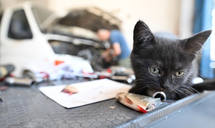 Düzce'de, motor ustası Mümin Ataseven'in sahiplenerek bakımını üstlendiği küçük kedi yavrusu, iş yerinde keyifli anların yaşanmasına vesile oldu.
