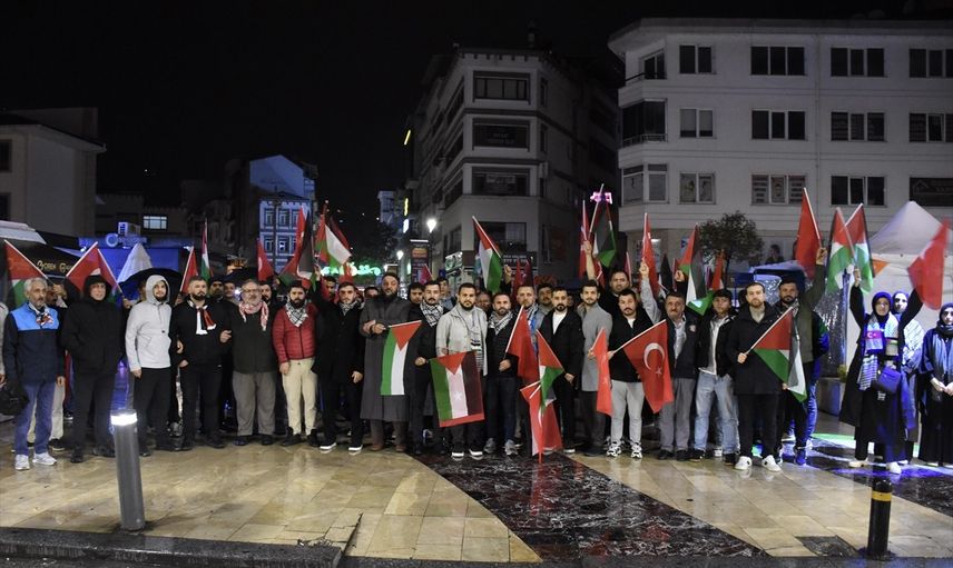 Özgür Aksa Trabzon Platformu, 15 Temmuz Şehitleri ve Hürriyet Parkı'nda bir araya gelen yurttaşlarla birlikte, saldırılara karşı sloganlar atarak Filonun yanındayız mesajını verdi. Katılımcılar, Türk ve Filistin bayraklarıyla çeşitli pankartlar taşıdı.