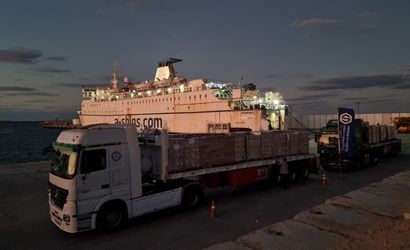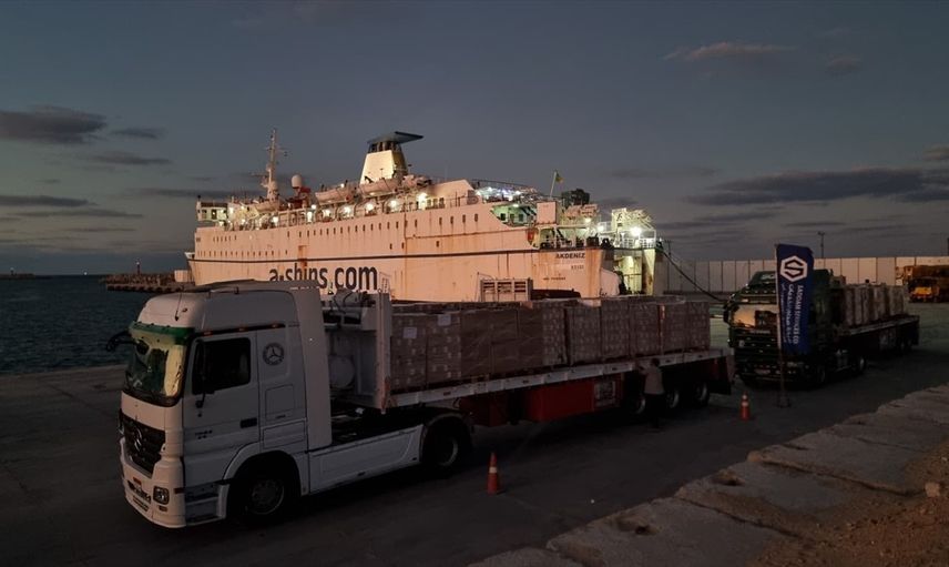 Türkiye'nin 17. "İyilik Gemisi"nden indirilen insani yardım malzemelerinin bir kısmını taşıyan 25 tır, Refah Sınır Kapısı'na doğru yola çıktı.
