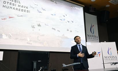 Türk Havacılık ve Uzay Sanayii AŞ (TUSAŞ) Genel Müdürü Dr. Mehmet Demiroğlu (sağ 3), Manisa Celal Bayar Üniversitesinde (MCBÜ) "Dönüşümü Yönetmek" konulu konferans verdi. Şehit Prof. Dr. İlhan Varank Yerleşkesi Prof. Ümit Doğay Arınç Kültür Merkezinde gerçekleştirilen programa, Rektör Prof. Dr. Rana Kibar (sol 3), rektör yardımcıları Prof. Dr. Kadir Ay (solda), Prof. Dr. Ahmet Çetin (sol 2) ve Prof. Dr. Oktay Üçer (sağ 2), dekanlar, müdürler, akademik ve idari personel ile çok sayıda öğrenci katıldı.