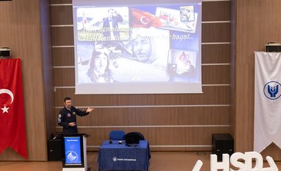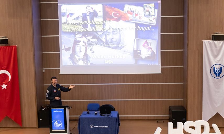 Türk Havacılık ve Uzay Sanayii (TUSAŞ) Eğitim Uçakları Baş Uçuş Test Pilotluğu Şefi ve HÜRKUŞ Test Pilotu Murat Özpala, İzmir'de üniversite öğrencilerine deneyimlerini anlattı.