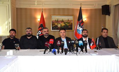 Trendyol 1. Lig ekiplerinden İmaj Altyapı Vanspor Futbol Kulübü Başkanı Erol Temel (sağ 3), kentteki bir otelde düzenlenen basın toplantısında açıklamada bulundu.